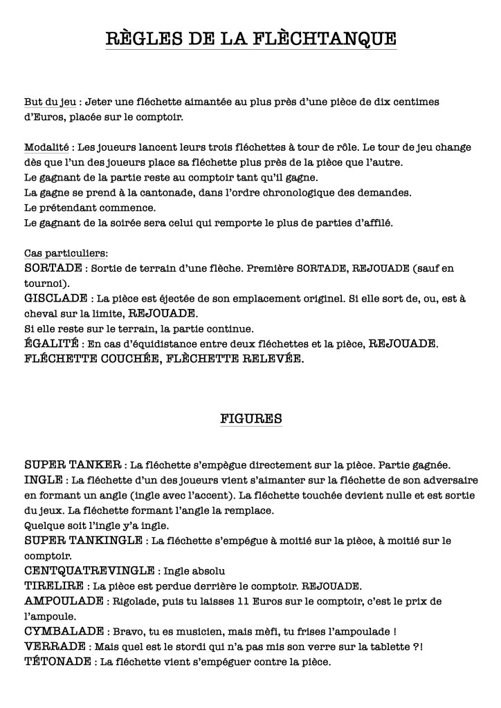 La Flechtanque se joue à 2 personnes, qui à tour de rôle tentent de tanquer 3 fléchettes aimantées au plus près de la pièce posée sur le bar en acier. Comme à la Pétanque, abrivade et adresse sont de mise.